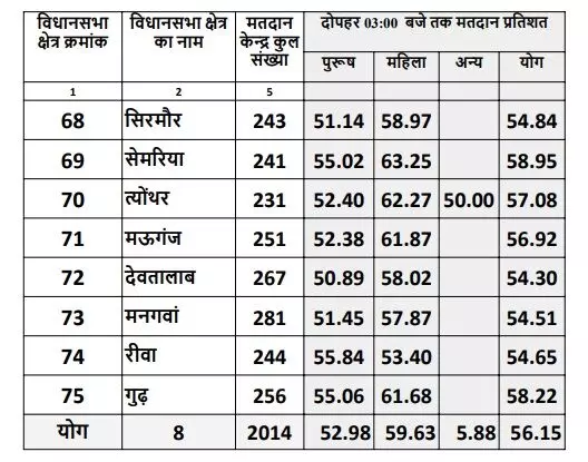 रीवा-मऊगंज जिले की सभी 8 विधानसभा सीटों पर दोपहर 3 बजे तक 56.15% मतदान दर्ज किया गया। सबसे कम 54.30% वोटिंग देवतालाब विधानसभा में जबकि सबसे अधिक 58.95% मतदान सेमरिया में हुआ है। मतदान को लेकर जिले भर में उत्साह देखा जा रहा है, खासकर कि महिलाओं में.. जिले की 8 मे से 7 विधानसभा में महिला वोटरों की संख्या पुरुष के मुक़ाबले काफी अधिक रही है। सिर्फ रीवा विधानसभा में महिलाओं की वोटिंग दर पुरुषों से कम दर्ज की गई है।
