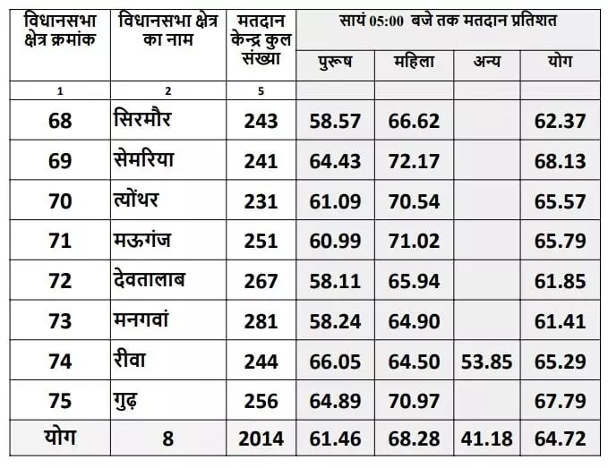 रीवा-मऊगंज जिले की सभी 8 विधानसभा सीटों पर शाम 5 बजे तक 64.72% मतदान दर्ज किया गया। सबसे कम 61.41% वोटिंग मनगवा विधानसभा में जबकि सबसे अधिक 68.13% मतदान सेमरिया में हुआ है।