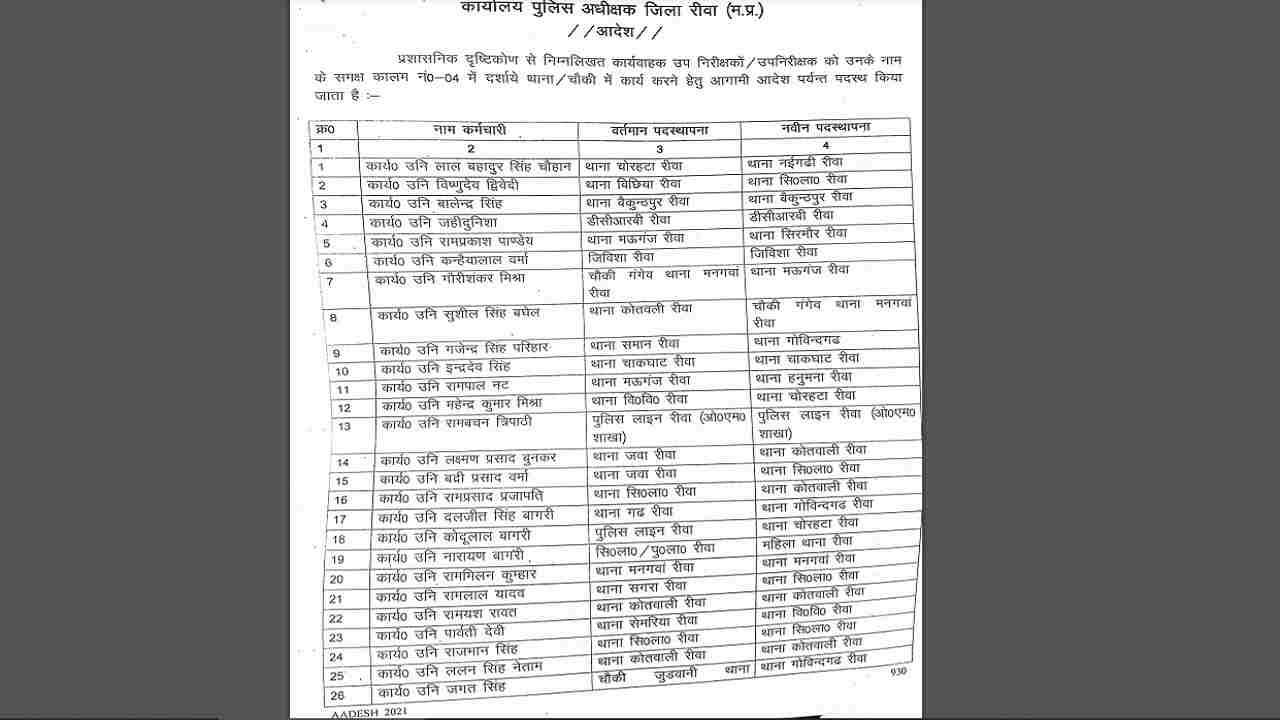 बता दे की लगातार मिल रही शिकायतों और कई सालो से एक जगह में जमे पुलिसकर्मियो का स्थानांतरण कर दिया गया है. यह लिस्ट खुद रीवा पुलिस अधीक्षक राकेश कुमार सिंह ने जारी की है.