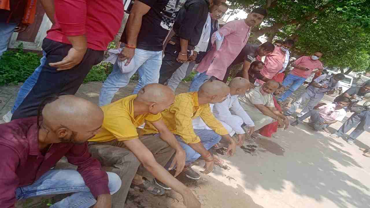 रीवा (Rewa News) : बघेली कलाकार अविनाश तिवारी व शैलू शर्मा के खिलाफ आक्रोश जारी है। बजरंग सेना के पदाधिकारियों ने धार्मिक भावना आहत करने का आरोप लगाते हुये बुधवार को एसपी कार्यालय के सामने नारेबाजी करके विरोध स्वरूप सामूहिक मुंडन करवाया है।