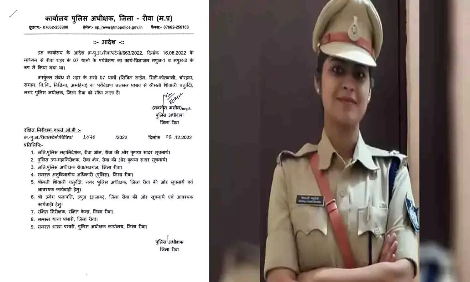 रीवा की CSP शिवाली चतुर्वेदी को मिली 7 थानों की कमान, List हुई जारी, एसपी ने जारी किया आदेश