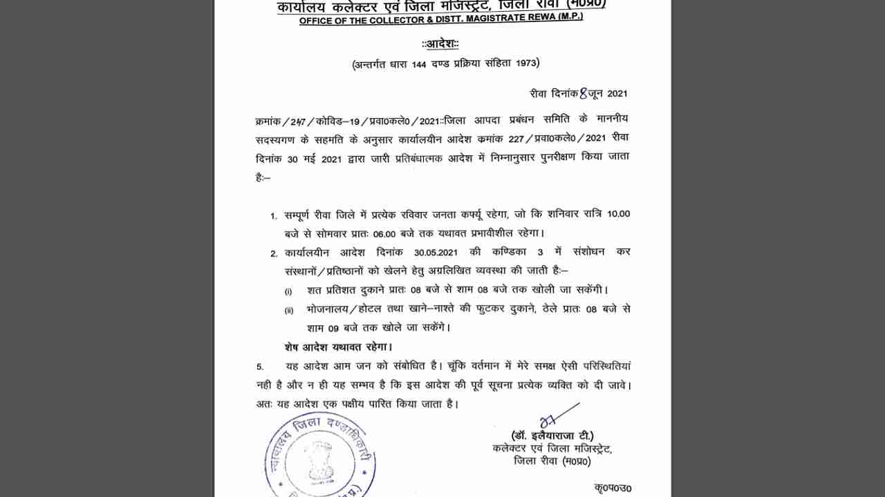 मिली जानकारी के अनुसार 8 जून को रीवा कलेक्टर डॉ. इलैया राजा टी ने आदेश जारी कर कहा की अब चाट फुल्की के ठेले भी लगेंगे, और होटल भी खुल सकेंगे लेकिन रविवार को जनता कर्फ्यु यथावत रहेगा l