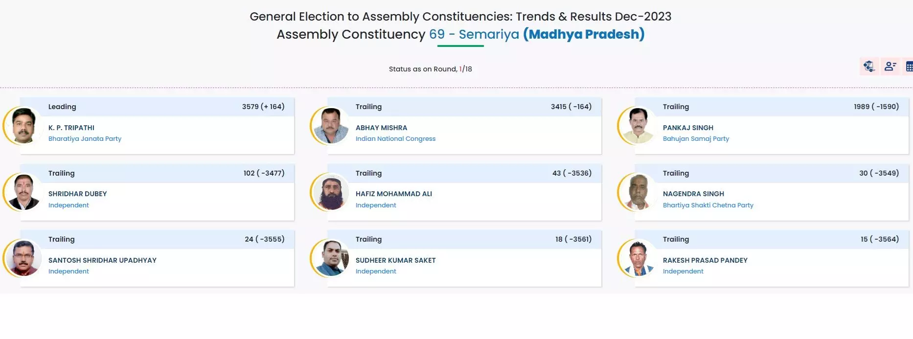 सेमरिया विधानसभा में भाजपा-कांग्रेस के बीच कांटे की टक्कर है। भाजपा प्रत्याशी केपी त्रिपाठी ने 164 वोटों से बढ़त बना रखी है। केपी को 3579 और कांग्रेस के अभय मिश्रा को 3415 वोट पहले राउंड में मिले हैं। बसपा के पंकज पटेल 1989 वोटों के साथ तीसरे स्थान पर हैं।