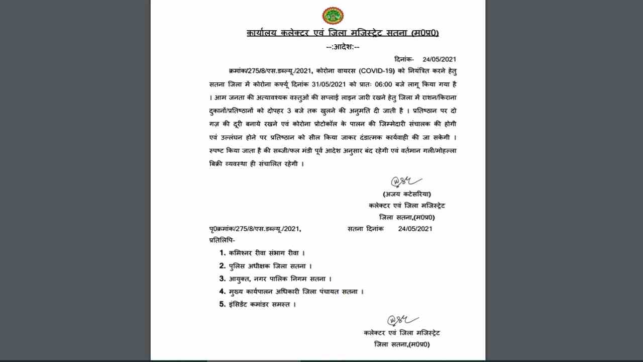 सतना : देश में बढ़ रहे कोरोना संक्रमण को देखते हुए कई राज्यों में कोरोना कर्फ्यू लगाया गया है. इस बीच मध्यप्रदेश के कई जिलों में कल से ढील देना शुरू कर दिया गया है. इस बीच सतना कलेक्टर एवं जिला मजिस्ट्रेट अजय कटेसरिया ने आदेश जारी कर कल से ढील देने की शुरुआत कर दी है.