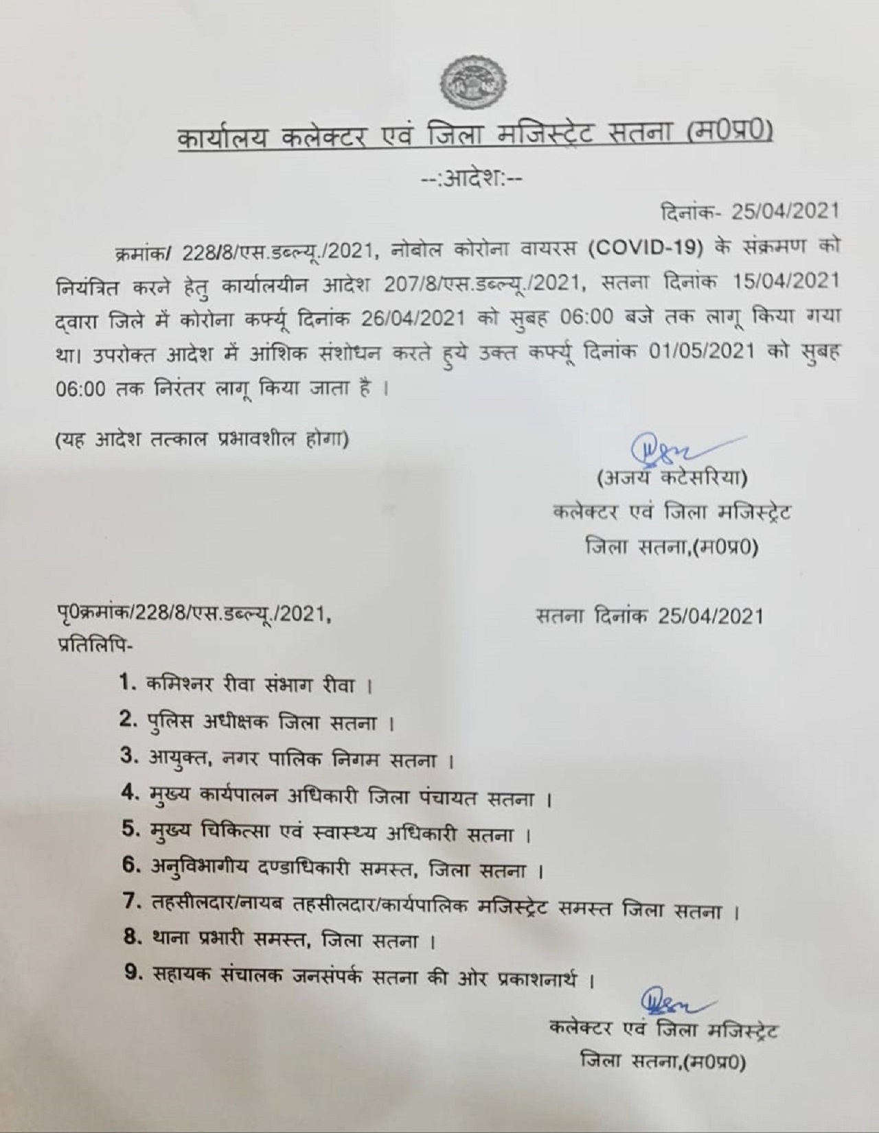 Satna Latest News Updates : नोबेल कोरोना वायरस ( Covid-19) के संक्रमण को नियंत्रित करने के उद्देश्य से कलेक्टर एवं जिला मजिस्ट्रेट (Satna Collector Ajay Katesaria) अजय कटेसरिया द्वारा 16 अप्रैल से 26 अप्रैल 2021 की सुबह 6:00 बजे तक जिले में लागू किए गए कोरोना कर्फ्यू की अवधि 1 मई 2021 की सुबह 6 बजे तक के लिए बढ़ा दी गई है।