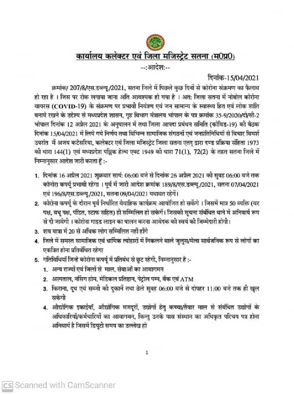 Satna Corona Curfew : कोरोना संक्रमण की श्रृंखला को तोड़ने और कोरोना संक्रमण के रोगियों के उपचार एवं बेहतर प्रबंधन के दृष्टिगत राज्य शासन द्वारा नियुक्त कोविड नियंत्रण के लिए सतना जिले के प्रभारी मंत्री रामखेलावन पटेल की अध्यक्षता में संपन्न जिला संकट प्रबंधन समूह, जिले के जनप्रतिनिधियों एवं समाजसेवी संगठन, व्यापारिक संगठन एवं विभिन्न वर्ग के प्रतिनिधियों तथा अधिकारियों की संयुक्त बैठक में जिले में शुक्रवार 16 अप्रैल की शाम 6 बजे से 26 अप्रैल की प्रातः 6 बजे तक अति आवश्यक गतिविधियों में छूट के साथ कोरोना कर्फ्यू लागू किए जाने पर सहमति बनी हैं।