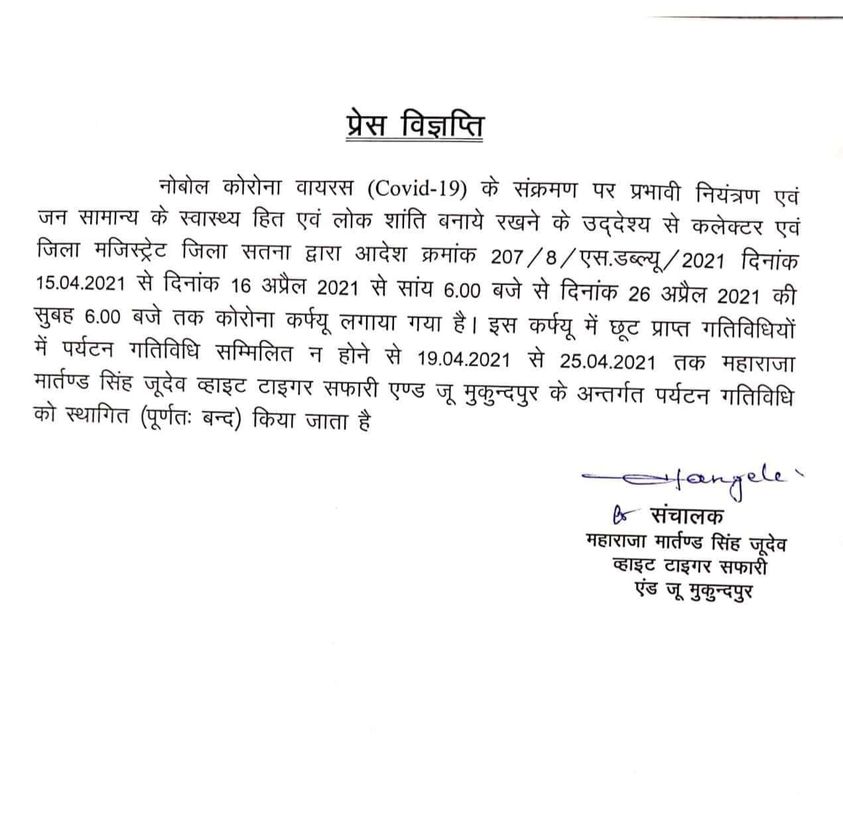 इस कर्फ्यू अवधि में छूट प्राप्त गतिविधियों में पर्यटन गतिविधि सम्मिलित न होने से 19 अप्रैल से 25 अप्रैल 2021 तक महाराजा मार्तण्ड सिंह जूदेव व्हाइट टाइगर सफारी एण्ड जू मुकुन्दपुर के अन्तर्गत पर्यटन गतिविधि को स्थगित (पूर्णतः बन्द) किया गया है।