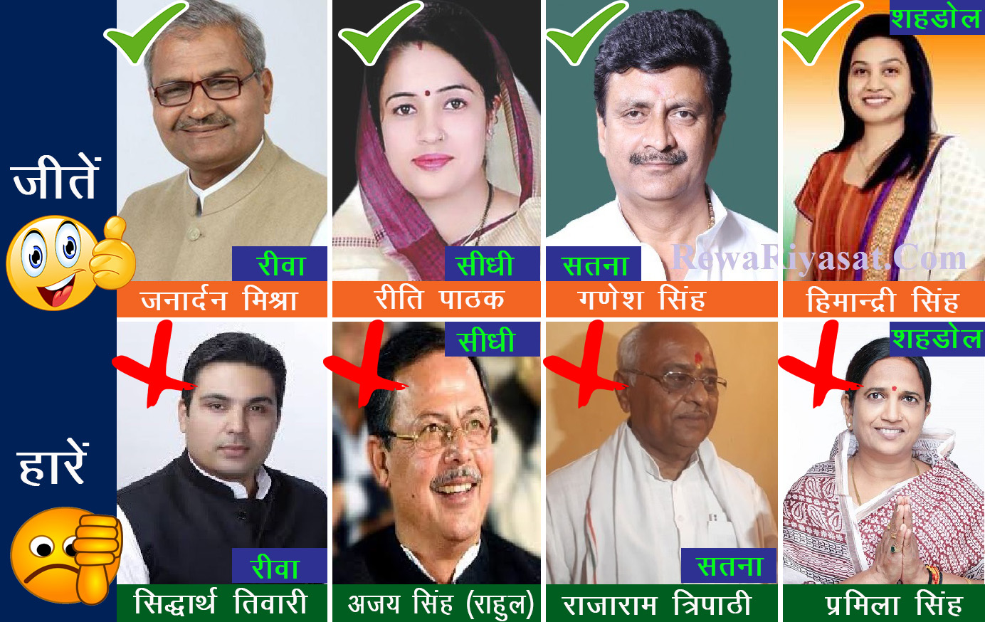 रीवा जीतें : जनार्दन मिश्रा, भाजपा (580769) निकटतम प्रतिद्वंदी : सिद्धार्थ तिवारी, कांग्रेस (270519) जीत का अंतर : 310250