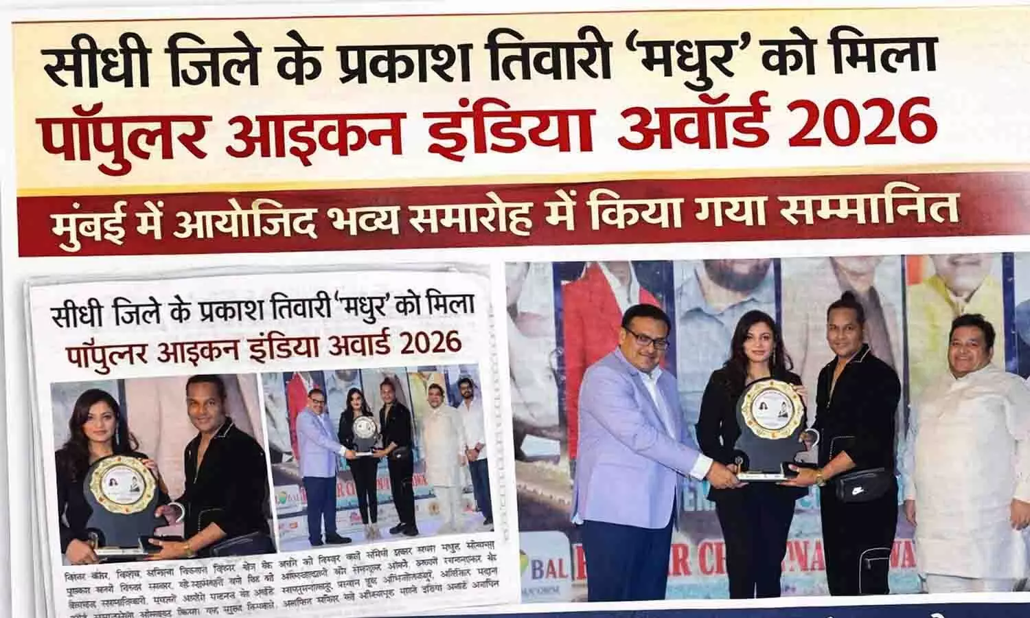 सीधी के लाल प्रकाश तिवारी 'मधुर' ने मुंबई में गाड़ा झंडा, 'पॉपुलर आइकन इंडिया अवॉर्ड 2026' से हुए सम्मानित