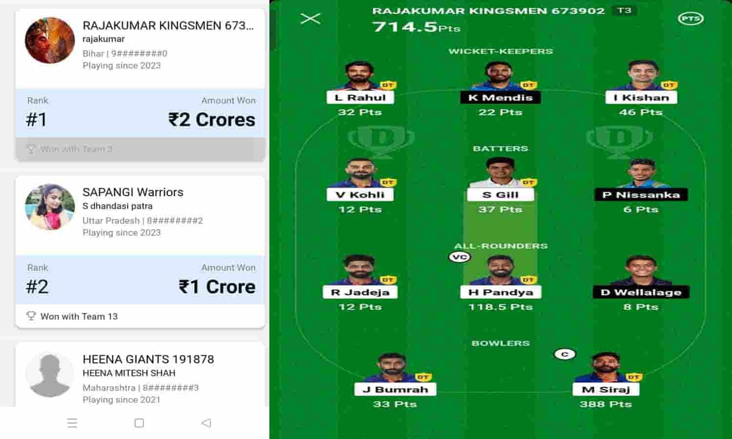 SL vs India के इस मैच में बिहार के Rajmar Kingsmen ने 636 पॉइंट के साथ 2 करोड़ रूपए जीते है. वही दूसरे नंबर में उत्तर प्रदेश की Sapangi Warriors के नाम से 757 पॉइंट के साथ 1 करोड़ रूपए जीते है.