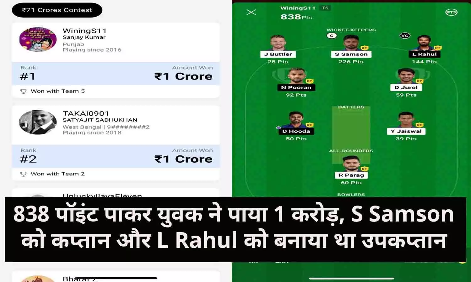 बात करें संजय कुमार की dream11 टीम की तो S Samson को उन्होंने अपना कप्तान बनाया था. Samson ने उन्हें 226 पॉइंट दिए वही R Rahul ने 144 पॉइंट दिए. जिसके चलते संजय कुमार 838 पॉइंट हासिल कर लीडर बोर्ड में पहले स्थान पर आ गए.