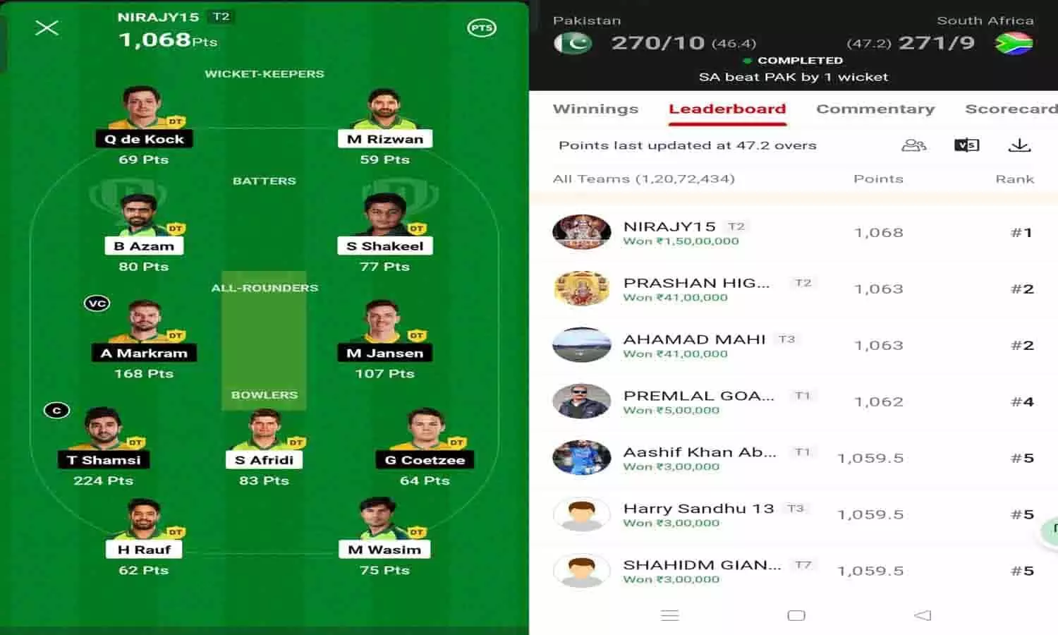Pakistan vs South Africa Dream11 Winner Name, Pakistan vs South Africa Dream11 Winner