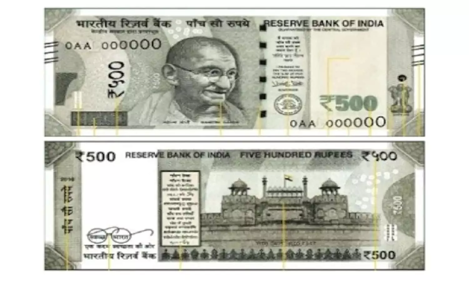 नोट को अगर किसी लाइट के सामने रखेंगे, तो इस जगह पर 500 लिखा हुआ नजर आएगा। आंख के सामने 45 डिग्री के एंगल से नोट को रखने पर इस जगह पर 500 लिखा हुआ दिखाई देगा इस जगह पर देव नागरिक ने 500 दिखाई देगा। महात्मा गांधी की तस्वीर को एकदम सेंटर में दिखाया गया है। भारत और इंडिया के लेटर्स लिखे दिखाई देंगे। एवं नोट को हल्का मोडेंगे तो सिक्योरिटी थ्रीड के कलर का कलर हरा से नीले में बदलता हुआ दिखाई देगा। पुराने नोट की तुलना में गवर्नर के सिग्नेचर, गारंटी क्लोज, प्रॉमिस क्लोज और आरबीआई का लोगो दाहिनी तरफ शिफ्ट हो गया है। यहां महात्मा गांधी की पिक्चर है और इलेक्ट्रोटाइप वाटरमार्क भी दिखेगा। ऊपर में लेफ्ट साइड और नीचे में राइट नंबर बाएं से दाएं की तरफ बड़े होते जाते हैं। यहां लिखे नंबर 500 का रंग बदलता है। इसका कलर हरा से नीला हो जाता है। राइट साइड अशोक स्तंभ है। राइट साइड सर्कल बॉक्स, जिसमें 500 लिखा है, राइट और लेफ्ट साइड की तरफ 5 ब्लीड लाइंस हैं और अशोक स्तंभ के प्रतीक, महात्मा गांधी की पिक्चर, जो रफली प्रिंट की गई है। नोट की छपाई का साल लिखा हुआ है। स्लोगन के साथ स्वस्थ भारत का लोगो प्रिंट है। सेंटर की तरफ लैंग्वेज पैनल है। भारतीय ध्वज के साथ लाल किले की पिक्चर प्रिंट है। देवनागरी में 500 प्रिंट है।