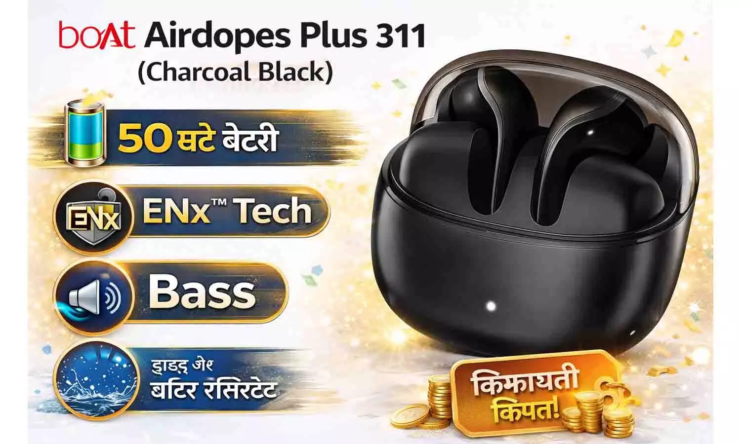 boAt Airdopes Plus 311 उन लोगों के लिए बेहतरीन है जो बजट में हाई-टेक फीचर्स चाहते हैं। 50 घंटे की बैटरी और फ़ास्ट चार्जिंग इसे यात्रियों और छात्रों के लिए बेस्ट बनाती है। Budget Phone 2026 के इस दौर में यह एक अनिवार्य एक्सेसरी है।