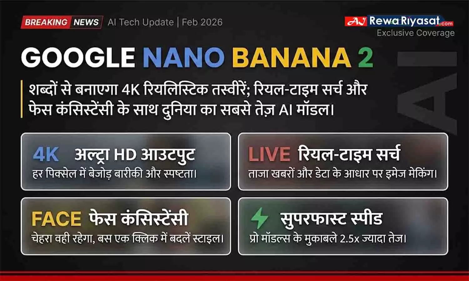 - गूगल ने पेश किया Nano Banana 2, जो 4K रेजोल्यूशन में बिजली की रफ्तार से इमेज जनरेट करता है।