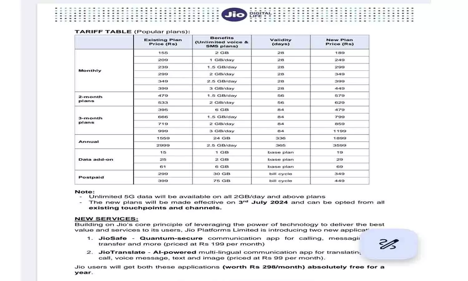रिलायंस जियो के प्रीपेड और पोस्टपेड प्लान की कीमत में 12% से 25% तक बढ़ोतरी कर दी है. कंपनी ने बताया है कि नई कीमत 3 जुलाई से लोगू हो जाएगी. जियो ने अपने टैरिफ टेबल में प्लान की पुरानी और नई कीमत की जानकार दे दी है, जिससे कि पता चल गया है कि कीमत बढ़ने के बाद अब ग्राहकों को कितना ज़्यादा खर्च करना पड़ेगा.