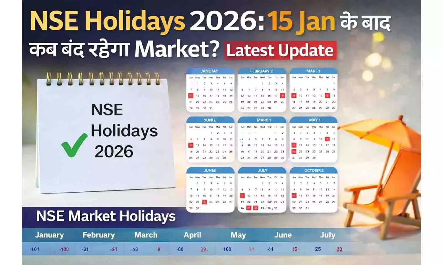 NSE Holidays 2026 उन सभी दिनों की आधिकारिक सूची है, जब भारतीय शेयर बाजार बंद रहेगा। इसमें राष्ट्रीय पर्व, त्योहार और विशेष अवकाश शामिल होते हैं।