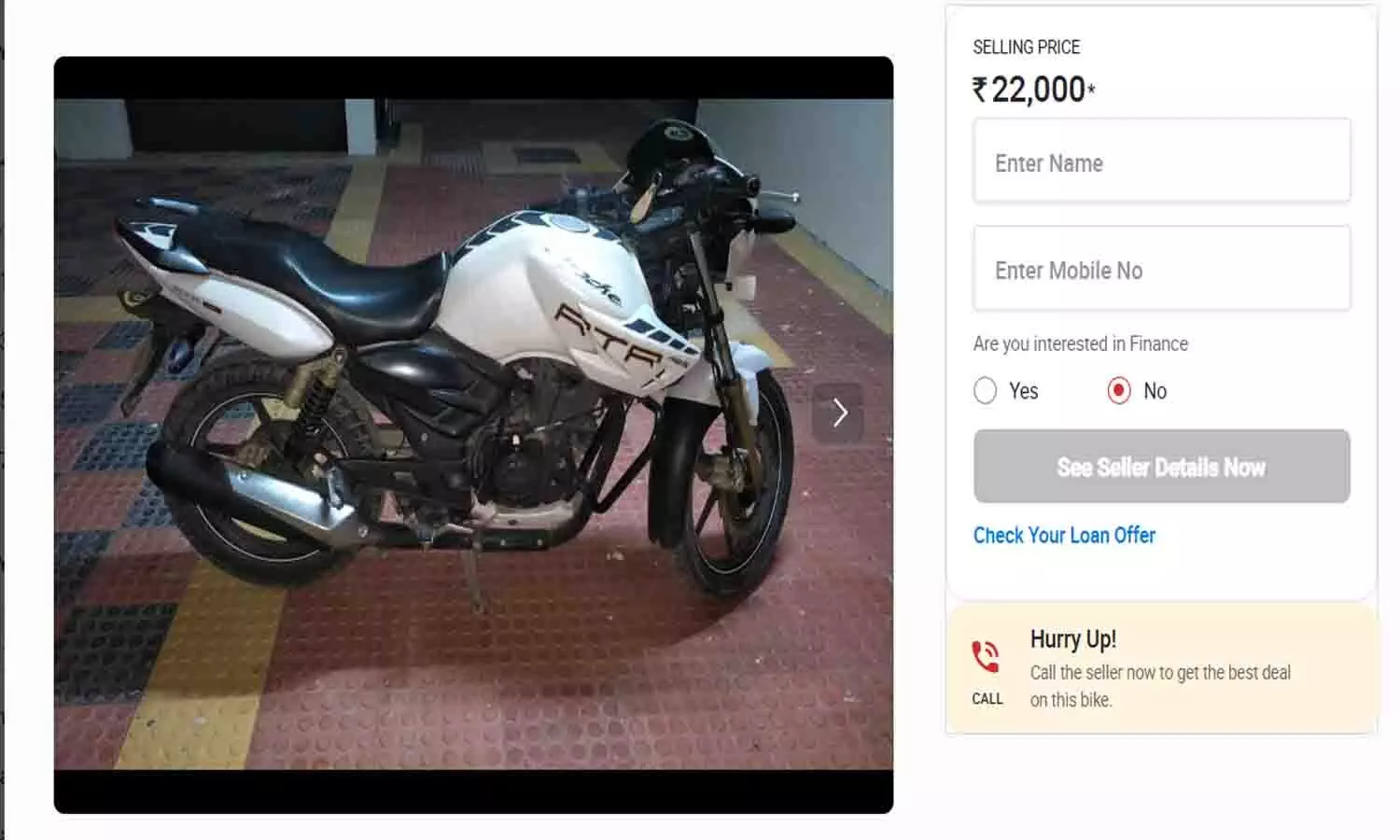 TVS Apache RTR 160 Dual Disc ABS Price In Hyderabad, Second Hand Bike In Hyderabad Ki News, Second Hand Bike In Hyderabad Update, Second Hand Bike In Hyderabad, Second Hand Bike In Hyderabad Hindi, Second Hand Bike In Hyderabad 2025, Hyderabad Me Second Hand Bike Kaha Milegi, Hyderabad Me Second Hand Bike Kaha Milti Hai, Second Hand Bike Hyderabad Ki News, Second Hand Bike In Hyderabad Latest Update: ऑफिस आने-जाने के लिए बाइक खरीदनी है लेकिन फिलहाल आपके पास नई मोटरसाइकिल खरीदने का बजट नहीं है तो टेंशन लेने की जरूरत नहीं.आइए आपको एक ऐसी बाइक के बारे में बताते हैं जिसकी कीमत वैसे तो लगभग ₹132000 है लेकिन ये बाइक आप लोगों को ₹22000 रुपये में मिल सकती है. कीमत देखने से आपको ये तो समझ ही गए होंगे कि इस दाम में आप लोगों को नई बाइक तो मिलने से रही, दरअसल कई ऐसे प्लेटफॉर्म्स हैं जहां Second Hand Bikes काफी सस्ते में मिल रही हैं.