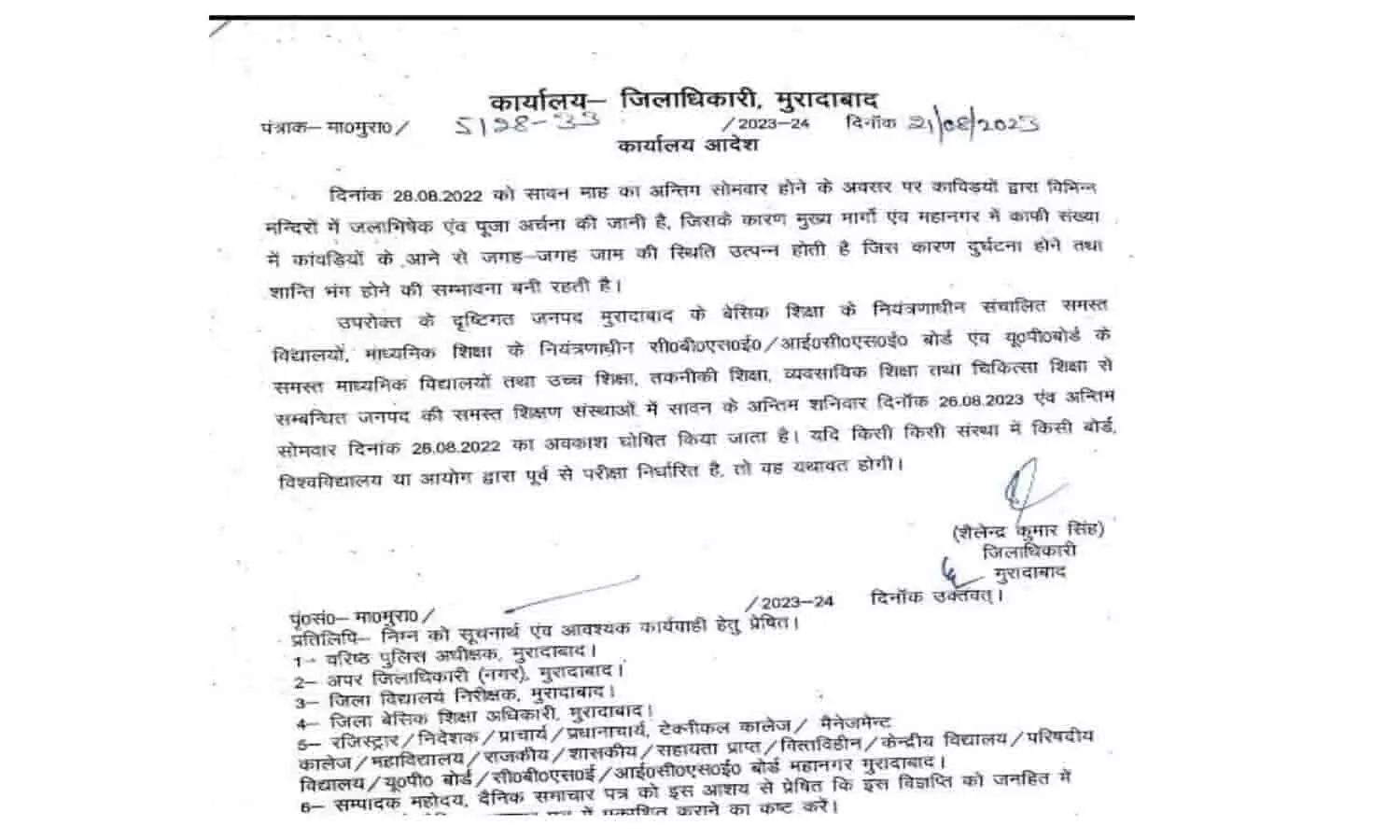 28 August 2023 School Holiday: मुरादाबाद के जिला अधिकारी शैलेंद्र कुमार सिंह ने सावन मास के अंतिम सोमवार को जिले के स्कूलों में अवकाश की घोषणा की है। इसके लिए विधिवत जिला अधिकारी द्वारा आदेश जारी कर दिया गया है। जारी किए गए आदेश के अनुसार जिले के अंदर संचालित सभी शासकीय एवं अशासकीय विद्यालयों में अवकाश की घोषणा की गई है। कलेक्टर की इस घोषणा से बच्चों में खुशी देखी जा सकती है।