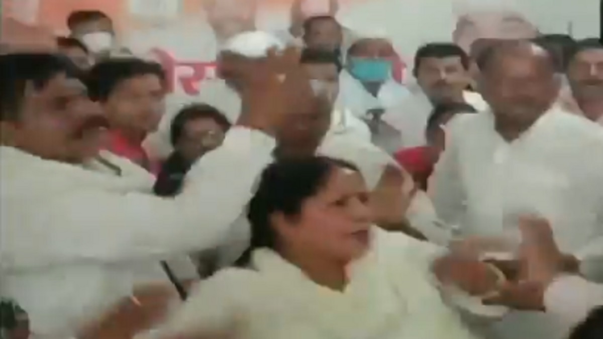 Congress' Tara Yadav manhandled by party workers at an event in Deoria.(10.10)