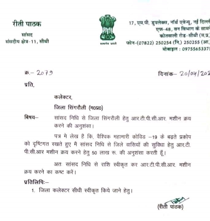 सीधी सांसद ने सिंगरौली एवं सीधी जिलों के कलेक्टर को पत्र लिख कर सांसद निधि से जारी की गई राशि का उपयोग आरटी-पीसीआर (RT-PCR) मशीन की व्यावस्था बनाने में खर्च करने का बात कही है।