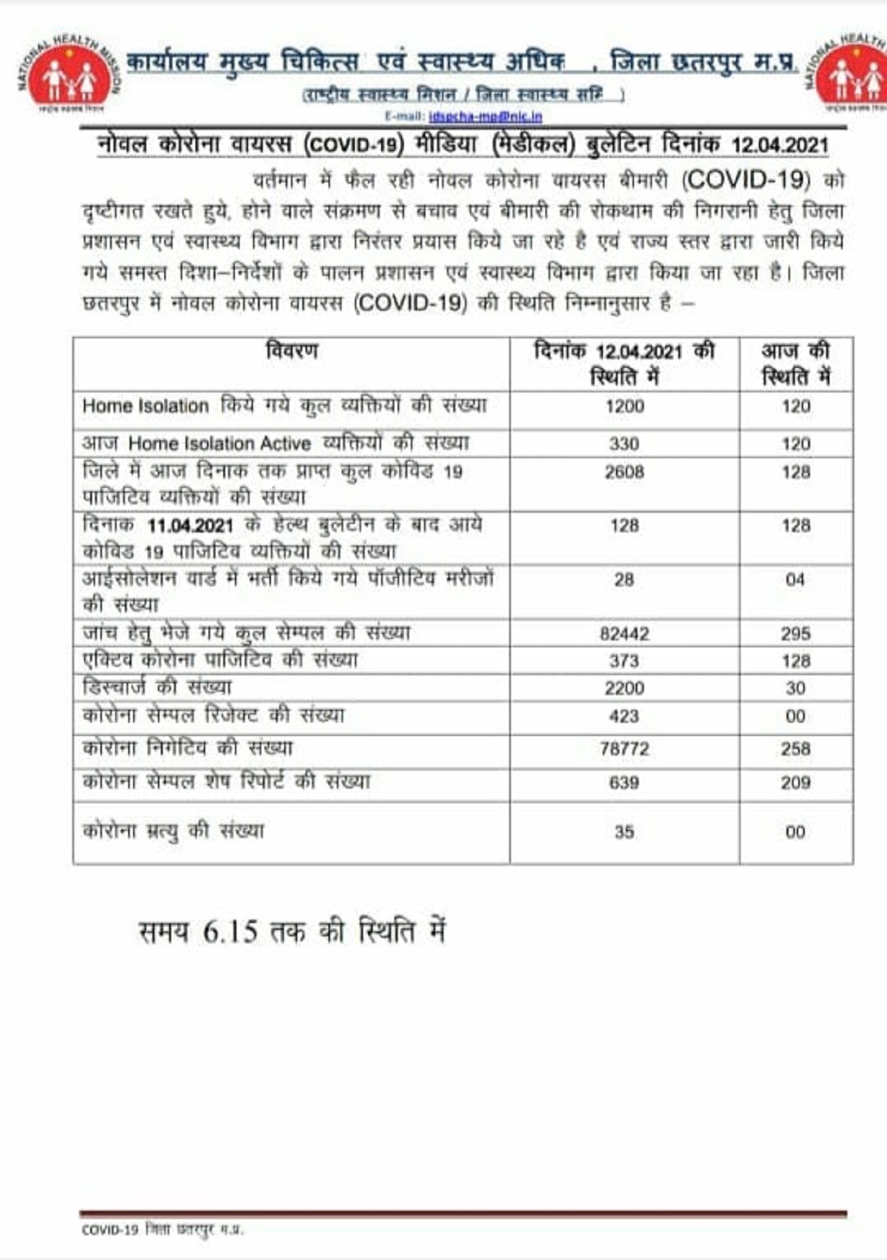 छत्तरपुर स्वास्थ विभाग द्वारा दी गई रिपोर्ट के अनुसार सोमवार को जिले में मिले 166 नए कोरोना वायरस मरीज। देखिये रिपोर्ट :