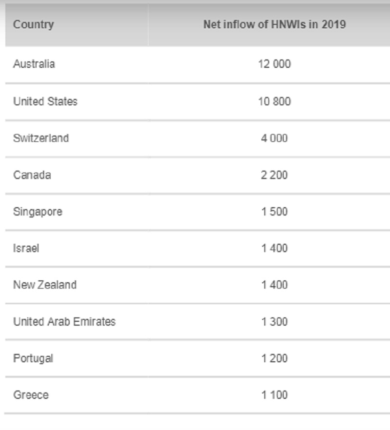 जबकि 12,000 HNWI के साथ, ऑस्ट्रेलिया ने 2019 में सबसे अधिक HNWI को आकर्षित किया। अमेरिका और स्विट्जरलैंड 10,800 और 4,000 HNWI को जोड़कर दूसरे और तीसरे स्थान पर रहे।