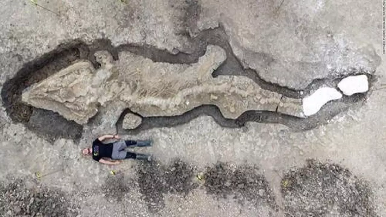 Giant 180 million-year-old sea dragon: ब्रिटेन में एक इचिथ्योसोर (Ichthyosaur) का 180 मिलियन वर्ष पुराना जीवाश्म खोजा गया है, जिसे शोधकर्ताओं ने इस क्षेत्र की सबसे महत्वपूर्ण खोजों में से एक बताया है. इंग्लिश ईस्ट मिडलैंड्स (English East Midlands) में रटलैंड काउंटी (county of Rutland) में एक जलाशय (reservoir) में खोजा गया, नमूना यूके में पाया गया अब तक का सबसे बड़ा और सबसे पूर्ण इचिथियोसौर जीवाश्म है, जिसकी लंबाई लगभग 33 फीट है और इसकी खोपड़ी का वजन एक टन है।