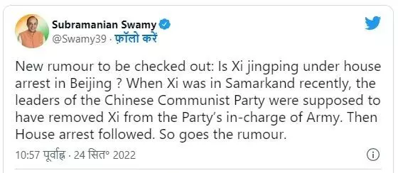Xi Jinping has been removed from the presidency and Li Qiaoming has been made the new President of China: पूर्व बीजेपी सांसद सुब्रमण्यम स्वामी ने ट्वीट करते हुए कहा है कि ''चीन को लेकर एक नई अफवाह आई है, जिसकी जांच होनी चाहिए। क्या शी जिनपिंग हॉउस अरेस्ट हो गए हैं ? माना जा रहा है कि जब Xi Jinping हाल ही में समरकंद (Samarkand) में थे, तब चीनी कम्युनिस्ट पार्टी (Chinese Communist Party) के नेताओं ने उन्हें सेना के अध्यक्ष पद से हटा दिया था। उसके बाद अफवाह है कि शी जिंगपिंग को हाउस अरेस्ट किया गया।